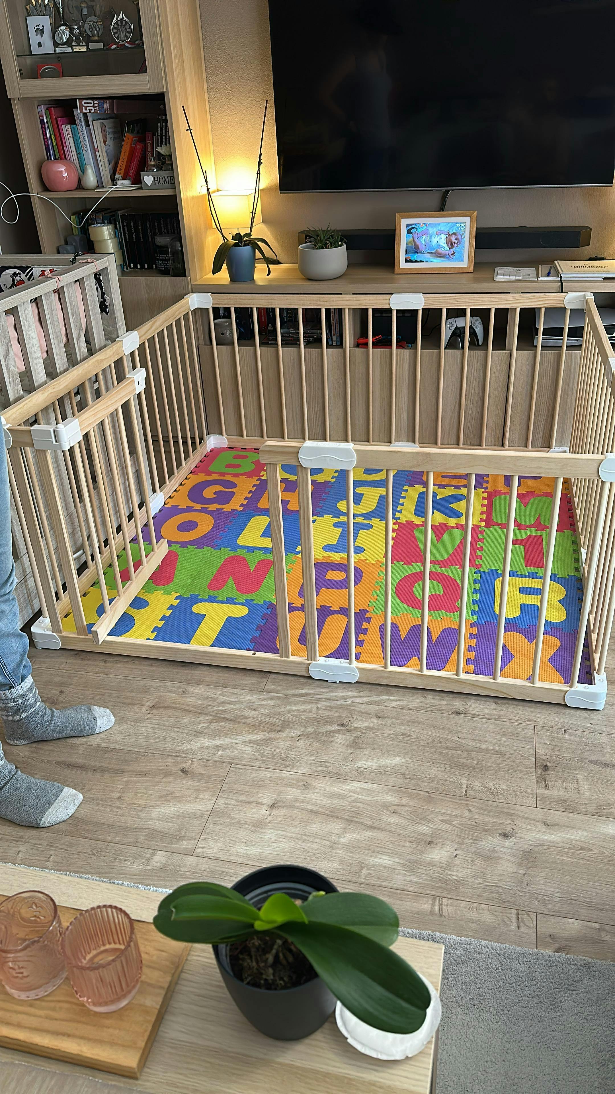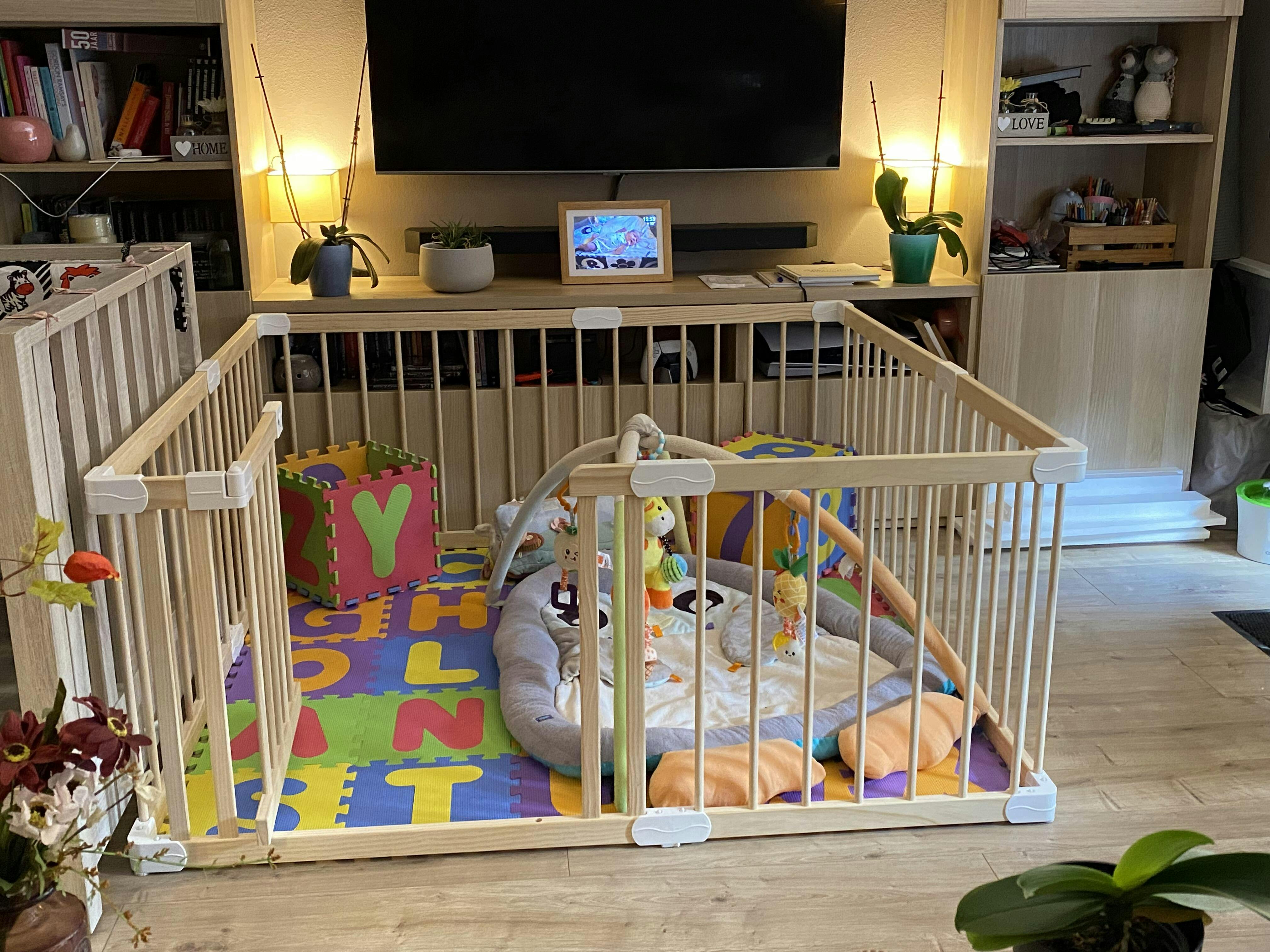Deze babybox van massief grenenhout biedt een veilige speelruimte zonder schadelijke stoffen. Het open ontwerp zorgt ervoor dat je kindje zich nooit opgesloten voelt en jij altijd zicht hebt.
